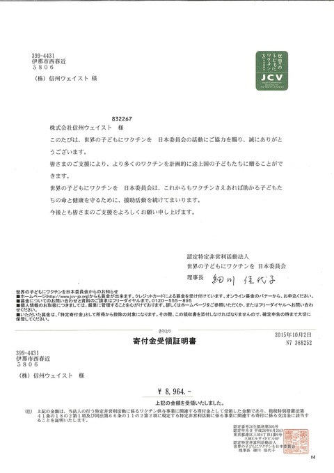 2015年9月1日から9月30日までに弊社にてお引き受けさせて頂きましたキャップに就きまして、世界の子供にワクチンを日本委員会(JCV)に寄付し、領収書が発行されましたので、ここにご報告させて頂きます。