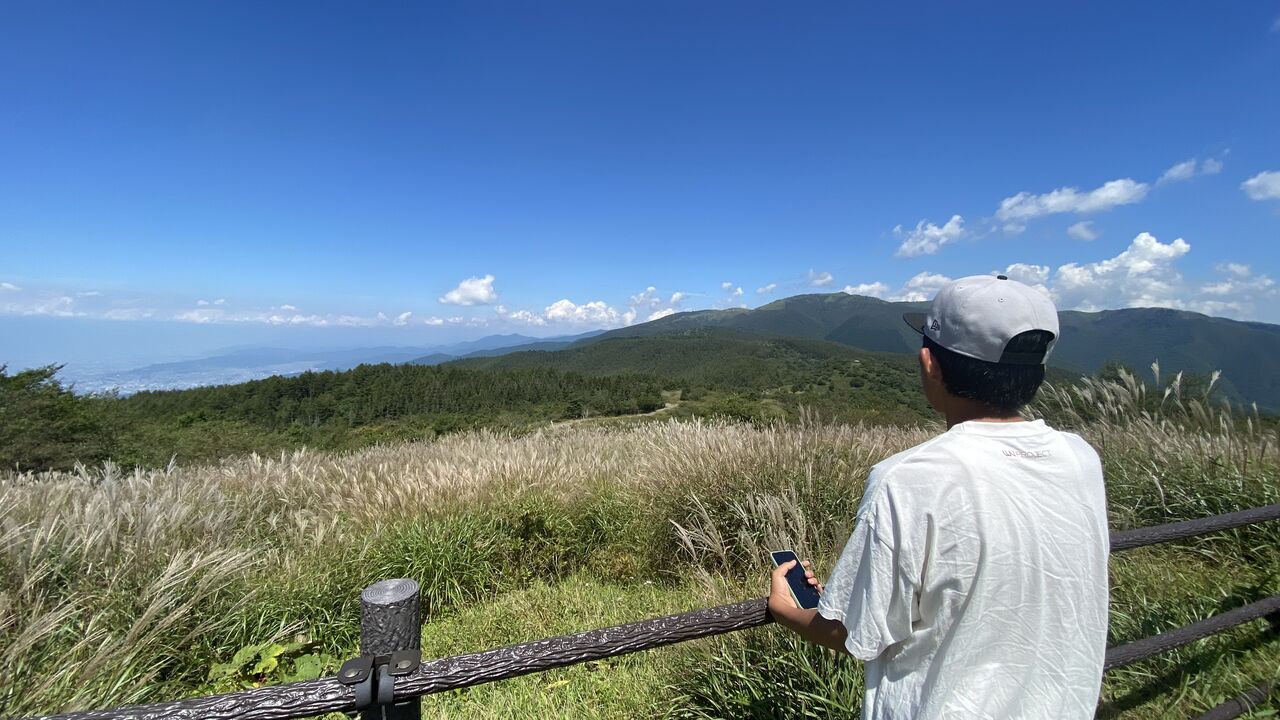 それならばと、高ボッチ高原に連れて行く事にしました。私も20年ほど前にカミさんと行ったことがありますがその時は霧が凄すぎて何も見えずそのまま引き返しました。なので私ももう一度行ってみたいと思っていました。今回は天気も良くすごく気持ちが良かったです。暑いのですがカラッとしてるので歩いても汗をかきません。駐車場から数百メートル歩き絶景ポイントに到着しました。