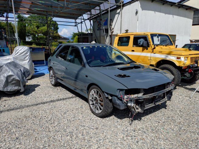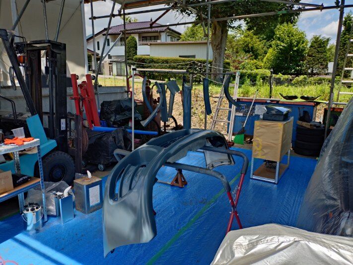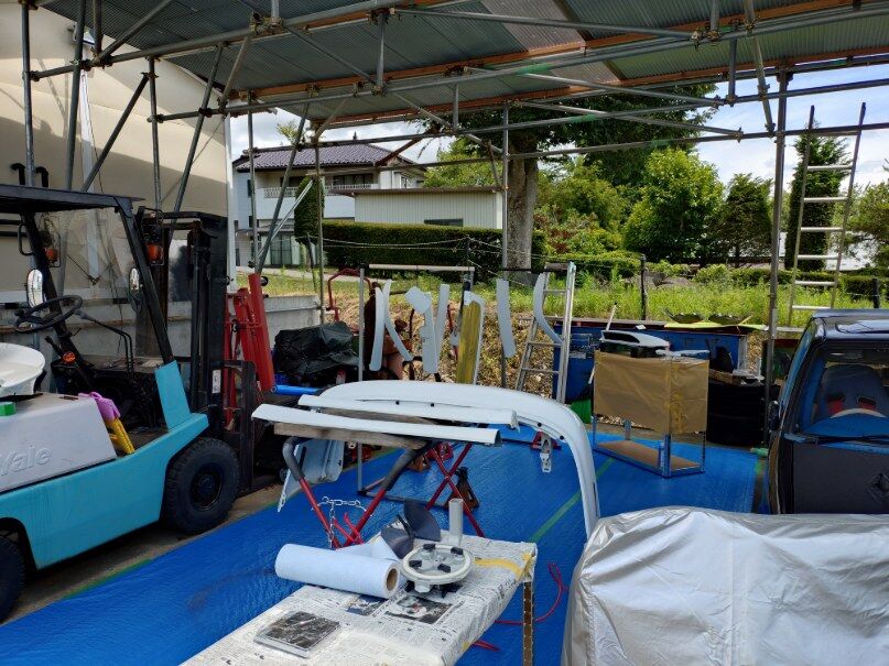 純正のエアロパーツを外した状態ですが、そのエアロパーツも結構痛んでいたので補修しながら作業を進めてます。