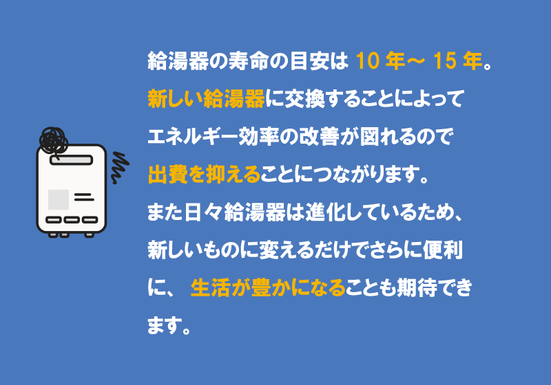 使用期間を過ぎた給湯器は、故障や事故のリスクが高まります。