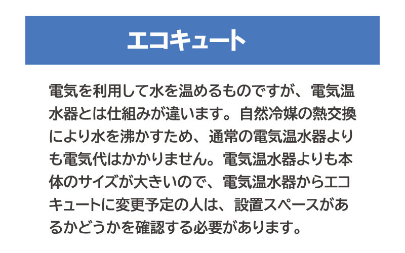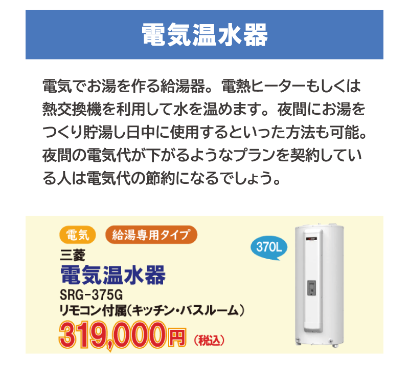 例えばNORITZのガス給湯器や石油給湯器、三菱の電気温水器、CORONAのエコキュートなど多種多様です。